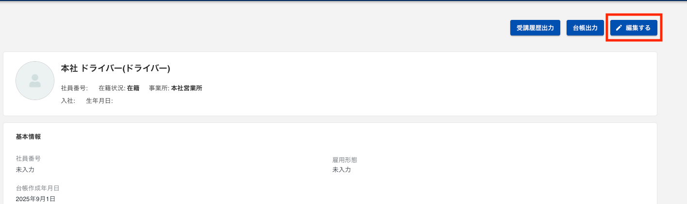 - 従業員詳細画面の右上にある「編集する」ボタンをクリックします。